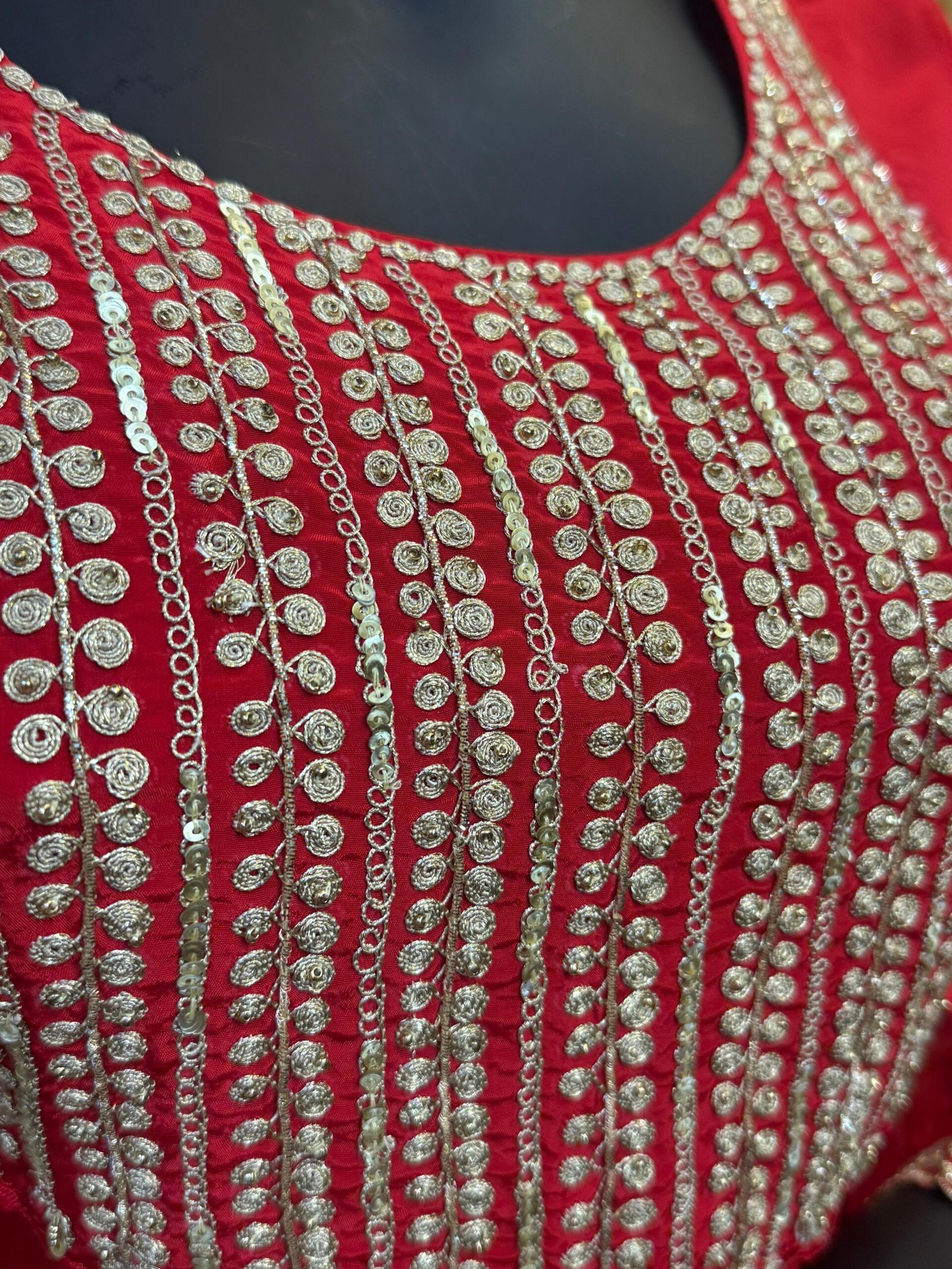 This stunning C-cut suit in rich red features graceful curved hemlines and flared plazo pants for a flowy silhouette. The neckline is beautifully adorned with vertical Zari embroidery, complemented by an ornate central motif and scalloped detailing on the sleeves and hem—perfect for festive celebrations or cultural gatherings.
