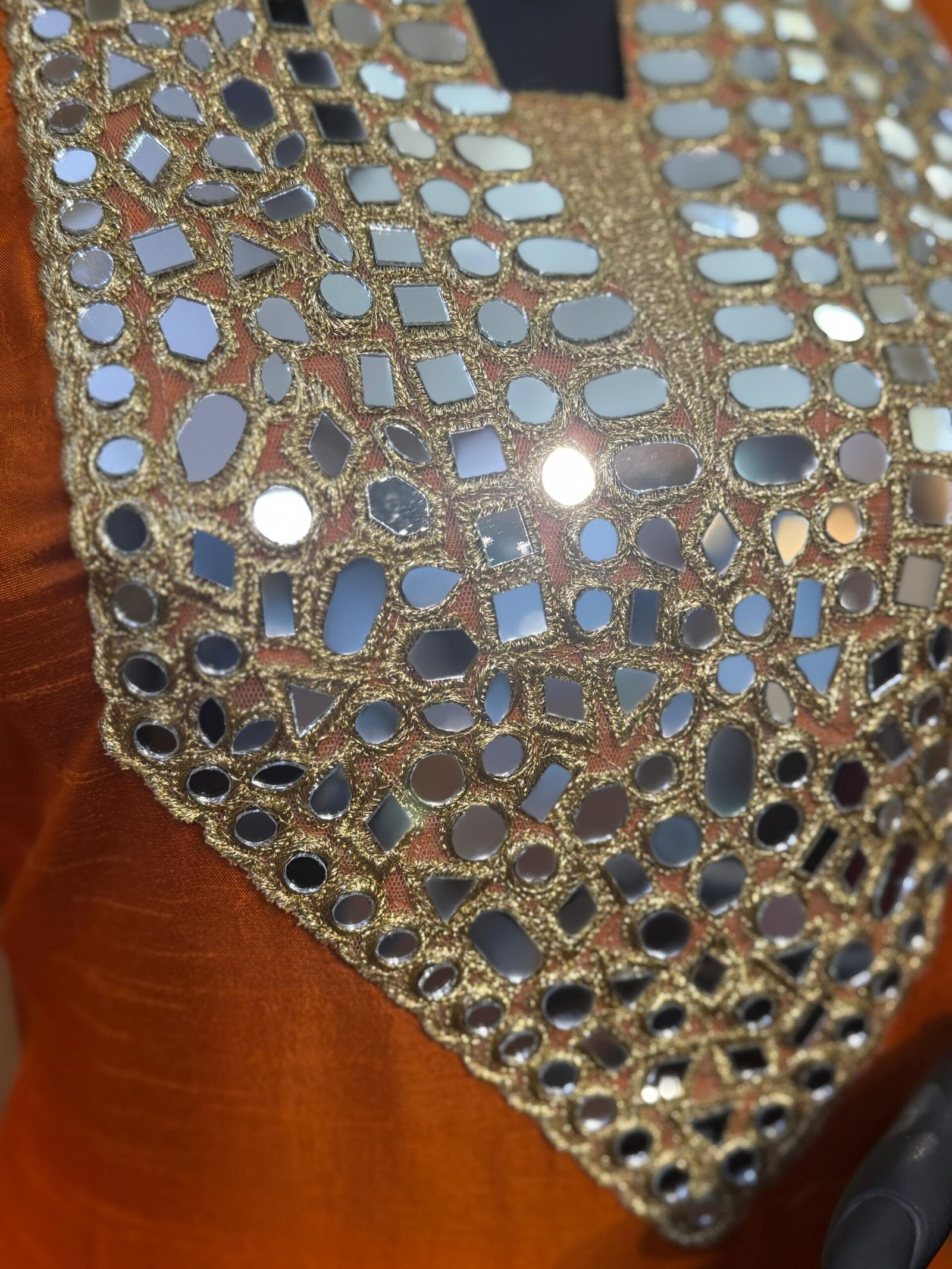This festive-ready Patiala set crafted from rich silk features a vibrant orange kurta adorned with all-over mirror work and zari embroidery. The V-neckline and sleeve cuffs are elegantly embellished with reflective accents that elevate the traditional silhouette. Paired with a voluminous farshi-style salwar, itβs a radiant pick for celebratory occasions or cultural gatherings.