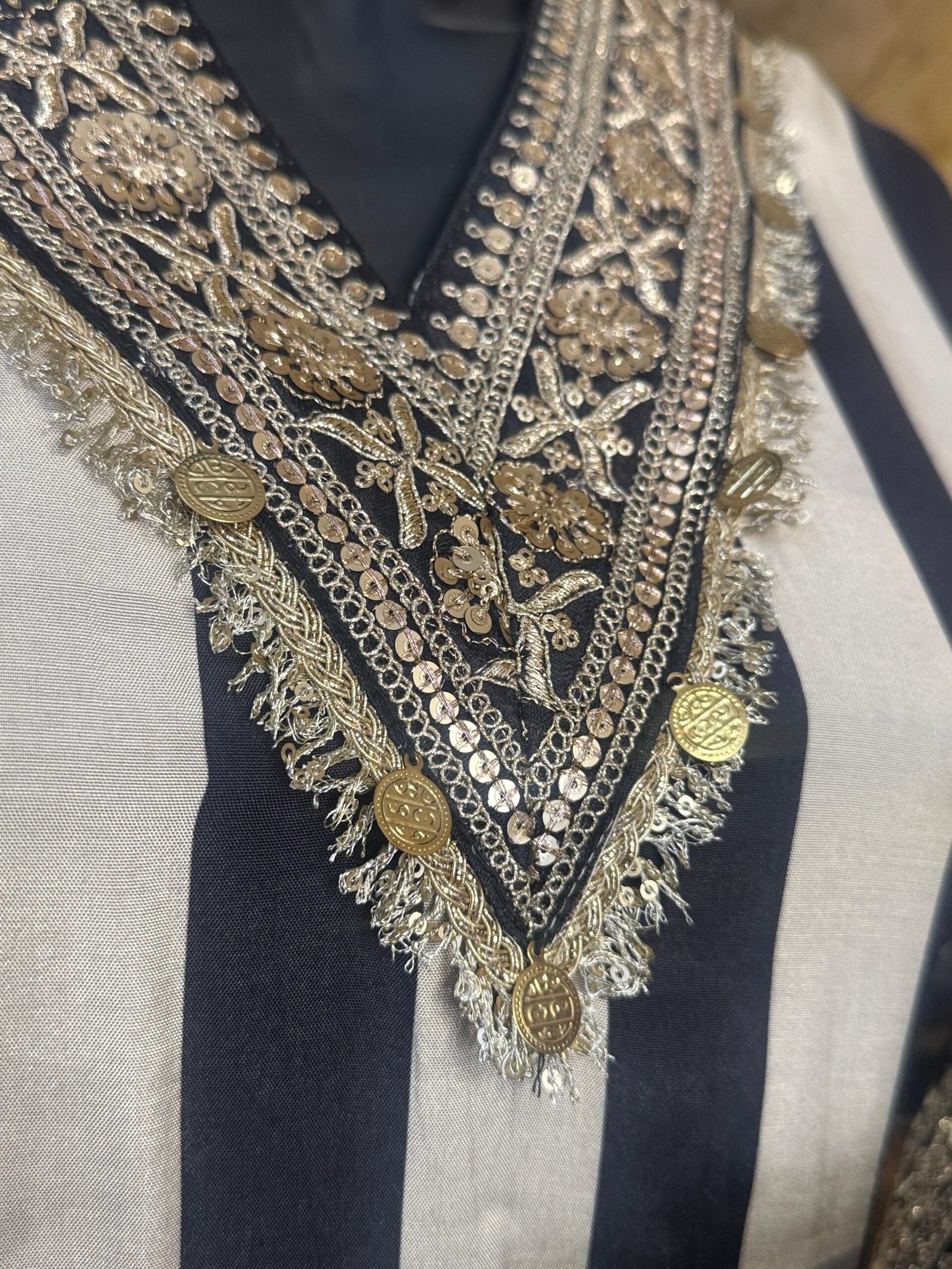 Crafted in breathable modal cotton, this black and ivory vertical striped co-ord set merges tradition with modernity. The kurta is adorned with rich zari embroidery on the neckline and cuffs, creating an elegant frame. Finished with subtle fringe trims and paired with sleek black pants, it’s perfect for evening elegance and formal wear.