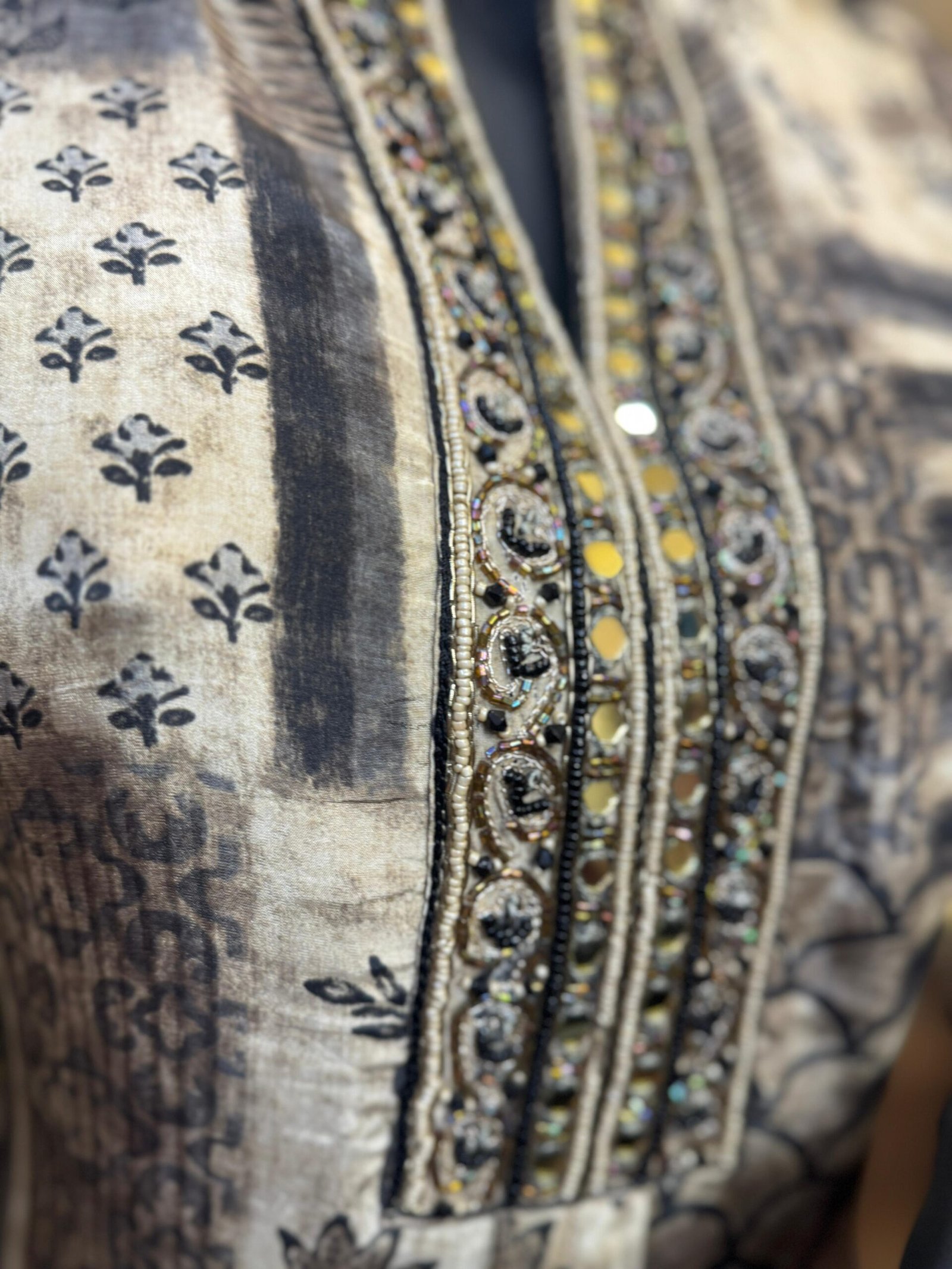 Crafted in smooth crepe fabric, this co-ord set exudes an understated luxury with a modern Indian aesthetic. The kurta features an eclectic patchwork-inspired digital print in tones of earthy grey, paired beautifully with mirror and katdana hand embroidery that accentuates the neckline with intricate detailing and subtle shimmer.