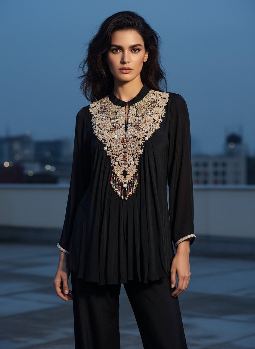 Crafted in fluid Chinnon fabric, this elegant black co-ord set pairs a delicately pleated long top with relaxed palazzo pants. The neckline is adorned with elaborate thread and pearl embroidery in floral and botanical patterns, highlighted with beaded tassel accents for a touch of traditional charm. The subtle shimmer and graceful silhouette make it a refined choice for evening affairs and festive celebrations.