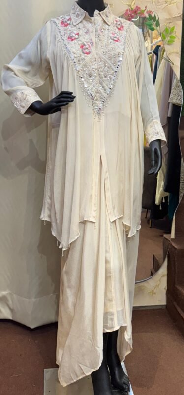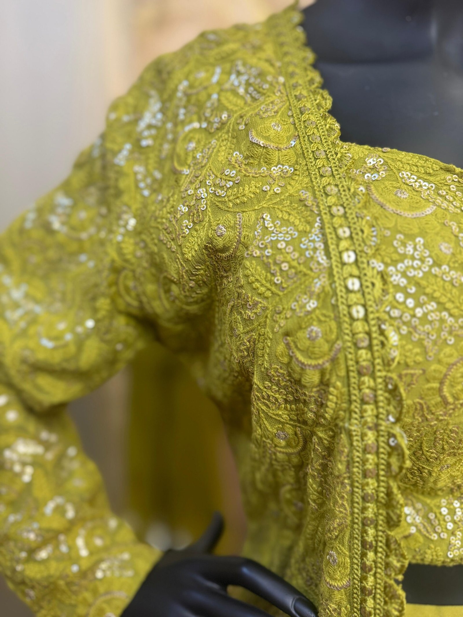 Step into contemporary elegance with this 3-piece indo-western ensemble crafted in flowy georgette. The set features a delicately embroidered crop top paired with wide-leg palazzo pants, layered with a matching open jacket adorned in intricate sequin and thread embroidery. The vibrant pop green hue adds a fresh, festive appeal, making it an ideal choice for celebrations, mehndi functions, or modern festive gatherings. Designed to balance comfort with statement style, this ensemble is perfect for those who love effortless glamour.
