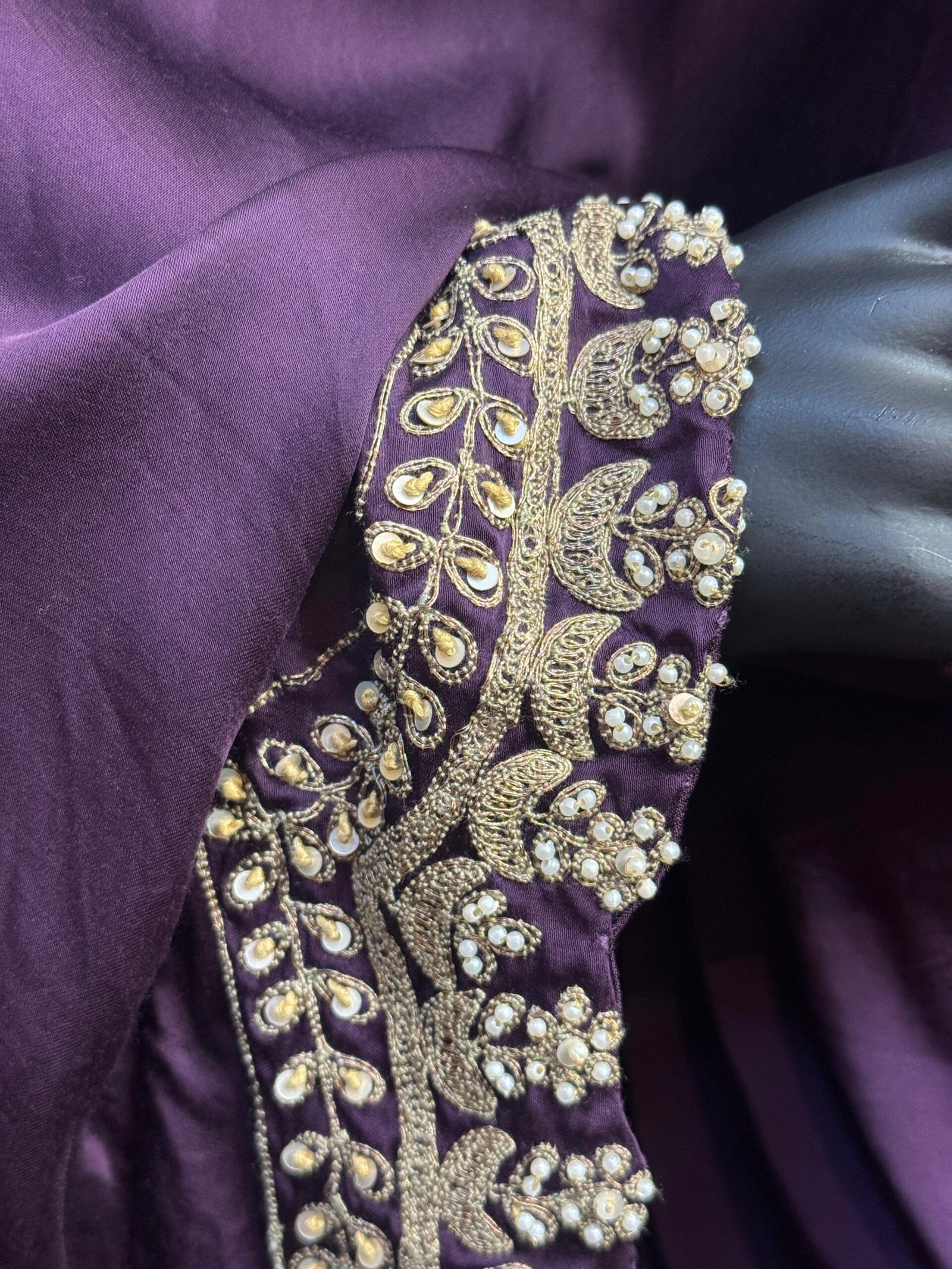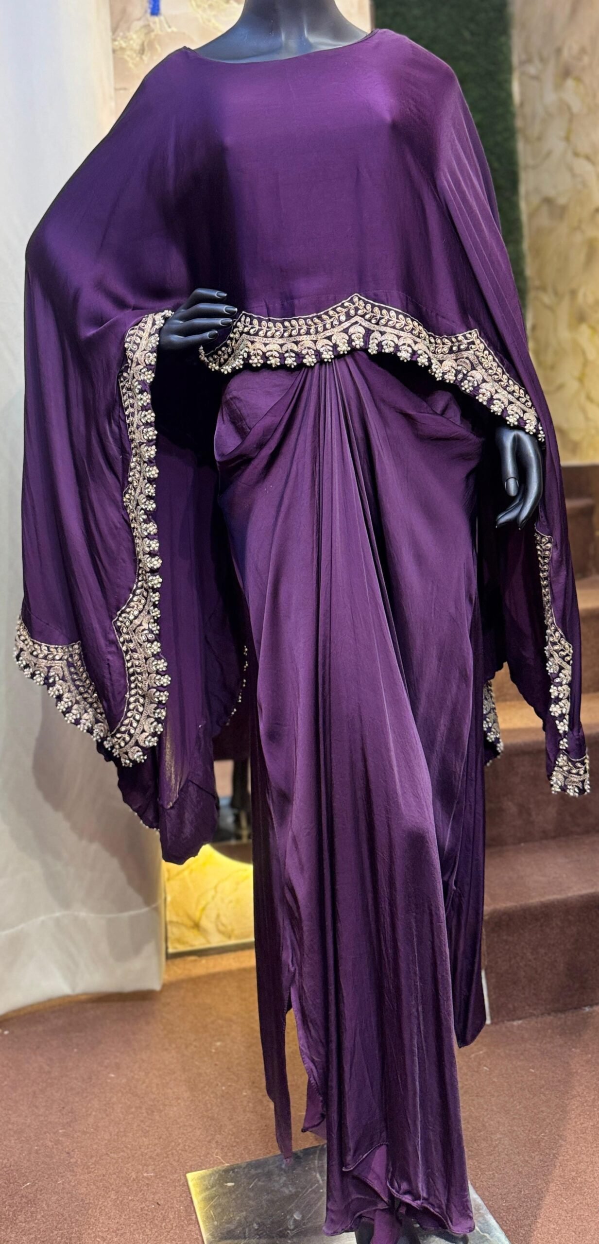 The soft sheen of the fabric enhances the deep purple hue, while the relaxed drape offers both comfort and sophistication. Perfect for evening celebrations, festive gatherings, or statement occasions, this indo-western set blends modern draping with timeless craftsmanship for a standout look.