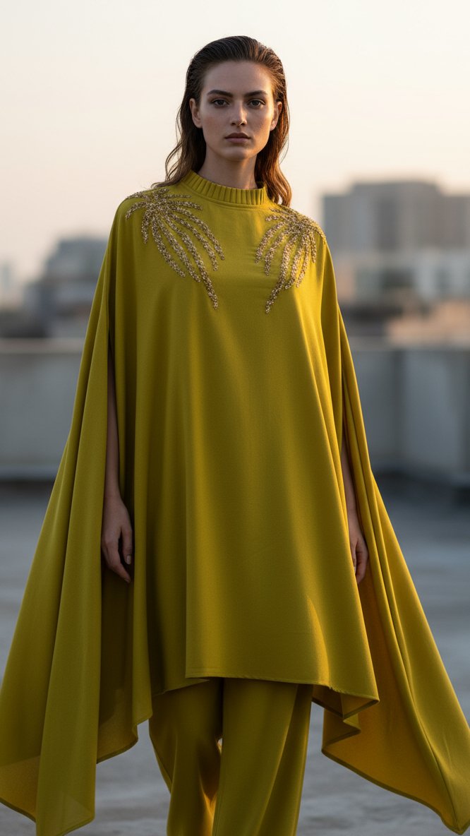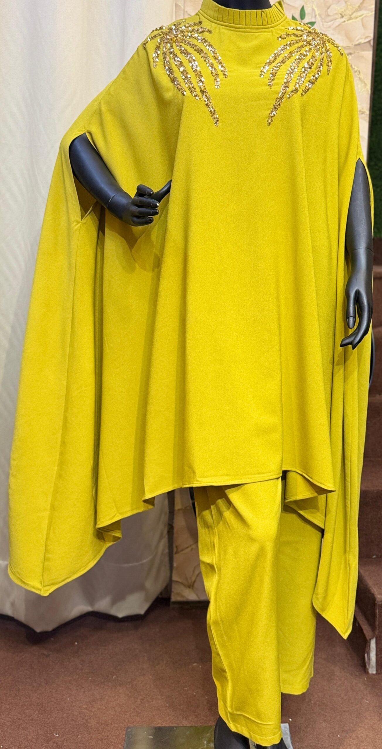 Make a bold style statement with this kaftan-style indo-western suit crafted in stretch lycra for effortless comfort and fluid drape. Designed with a contemporary cape silhouette, the outfit features shimmering sequin embroidery placed along the shoulders, adding a touch of glamour without overpowering the look. The relaxed kaftan top pairs seamlessly with matching straight-fit pants, creating a balanced and flattering ensemble.