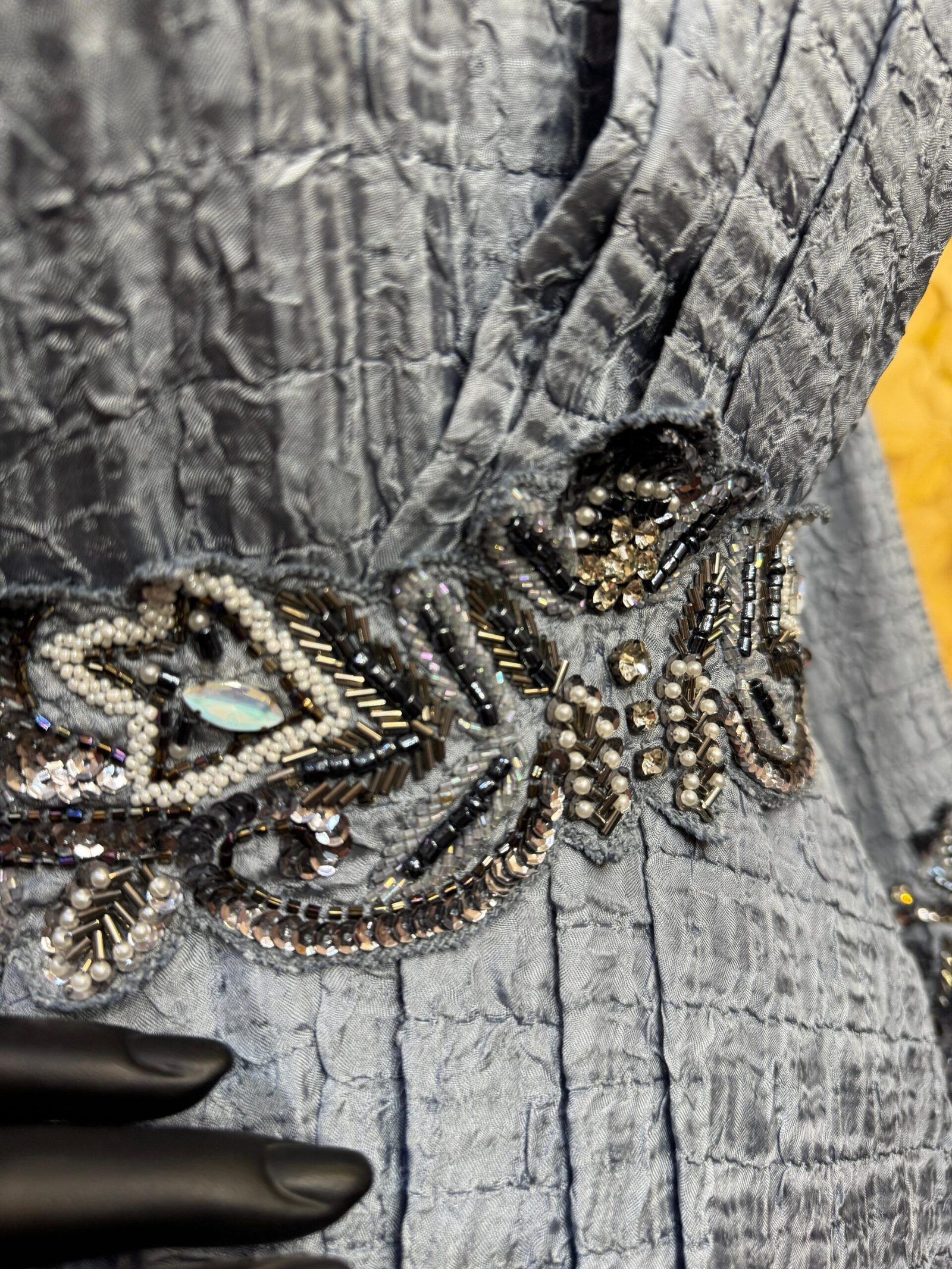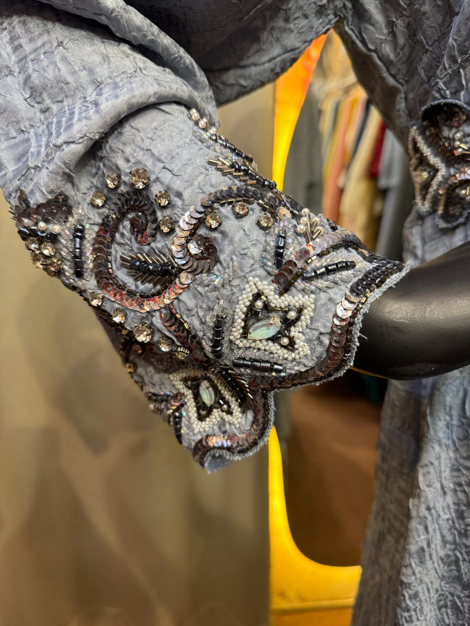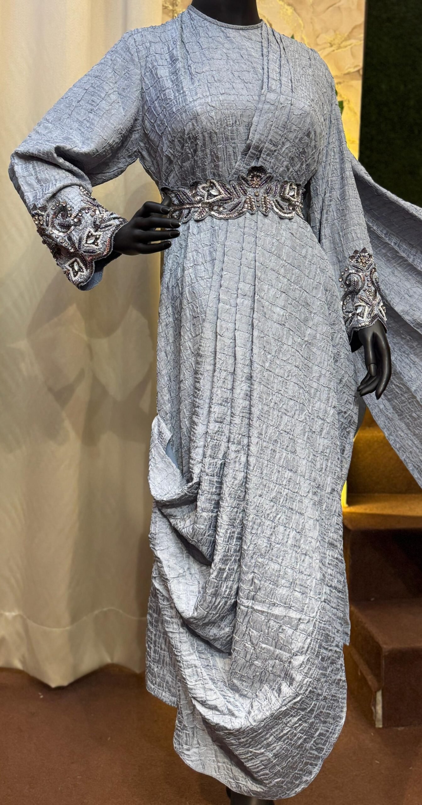 The soft steel grey hue lends a modern, understated elegance, making it an ideal choice for festive celebrations, evening gatherings, and statement occasions. Comfortable yet striking, this drape dress blends artisanal detailing with timeless style for a polished, graceful look.