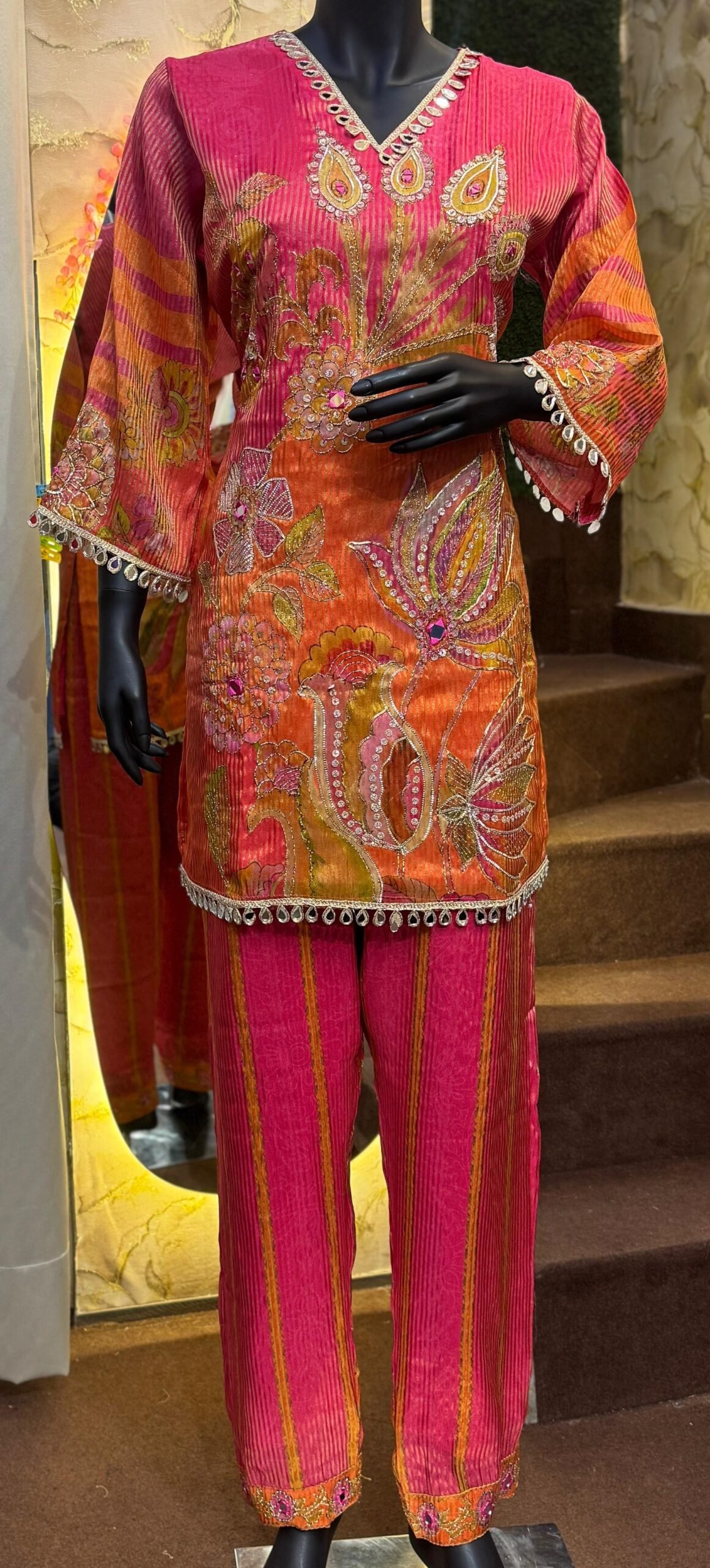 A radiant expression of festive vibrance, this co-ord set features a kurta and pants in a luxurious silk fabric. The kurta showcases intricate zari and mirror embroidery in floral and paisley motifs over a vivid pink and orange base, with delicate lace detailing on the hem and sleeves. Paired with striped coordinating pants, it’s an ideal ensemble for celebratory evenings and ethnic elegance.