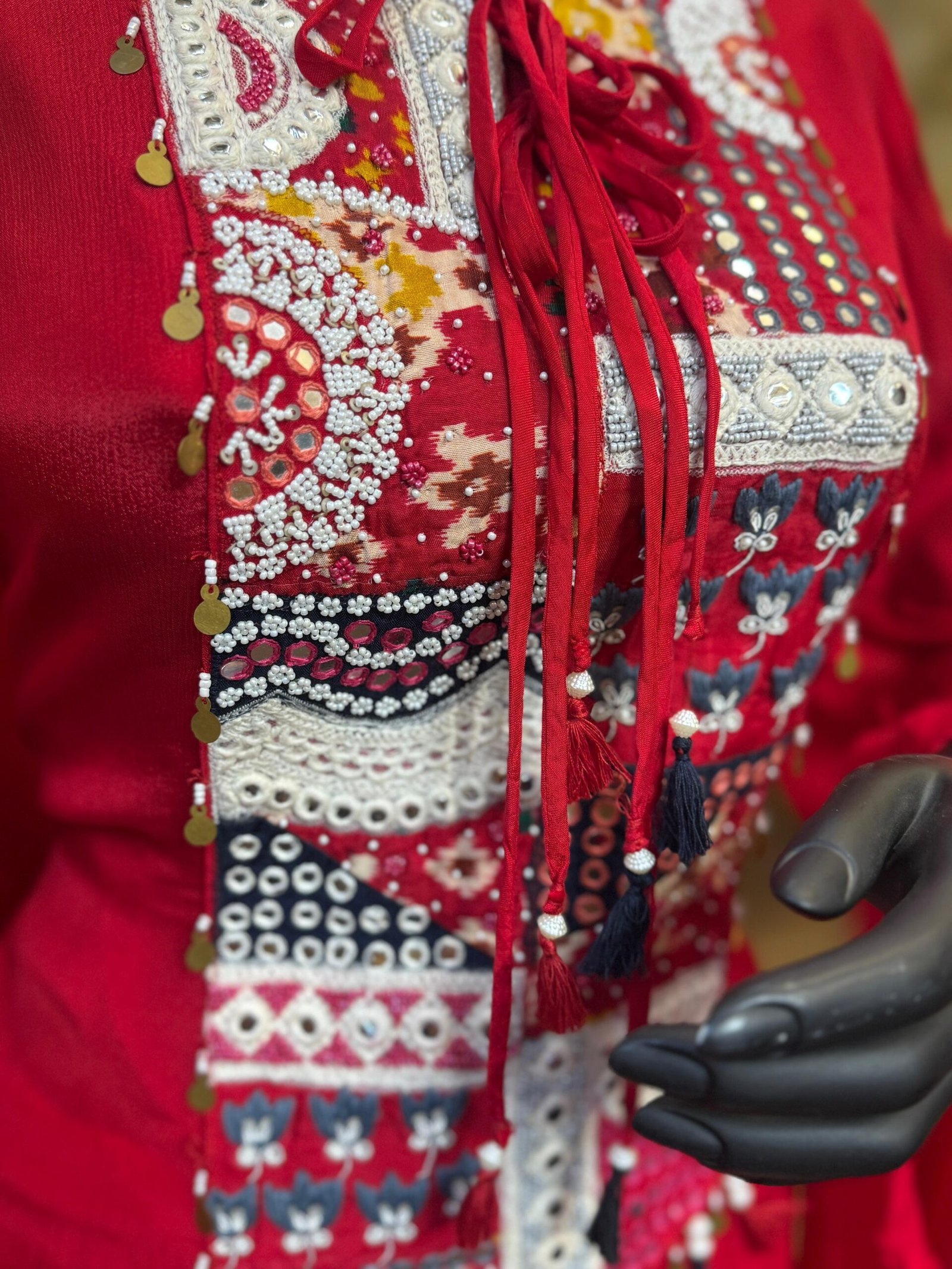 Channel dramatic elegance with this striking co-ord set in rich Chinnon fabric. Featuring a free-flowing silhouette with layered flare and wide sleeves, the set is adorned with intricate tribal-inspired thread embroidery and mirror embellishments along the front panel. The tassel tie-up adds a playful ethnic charm, making this ensemble a bold yet graceful choice for festive gatherings and cultural events.